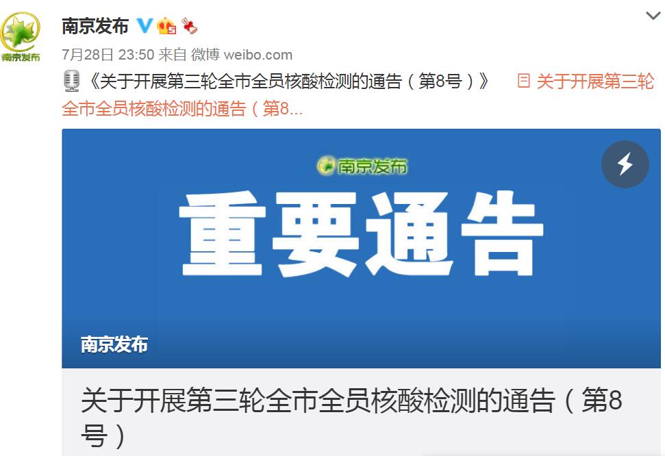 來源:“南京發布”微博檢測范圍:全市范圍內全部居民(含暫住人...